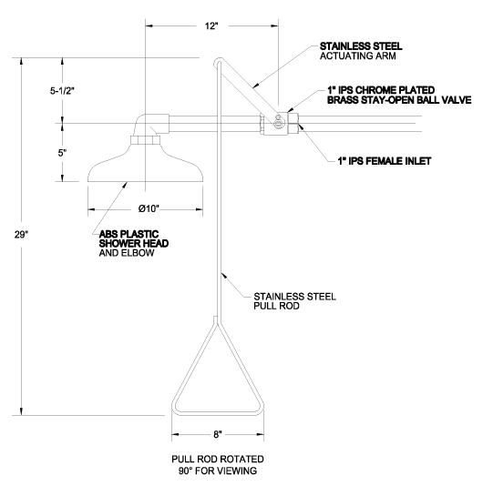Horizontonally mounted emergency shower with stay-open valve and pull rod.