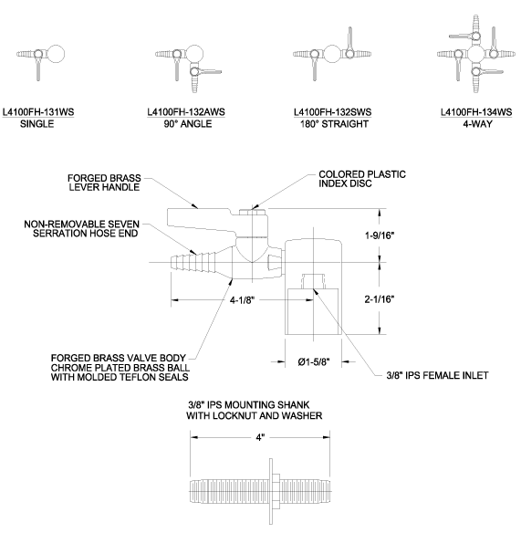 Deck mounted turret base w/ single laboratory ball valve w/ integral straight serrated hose and mounting shank