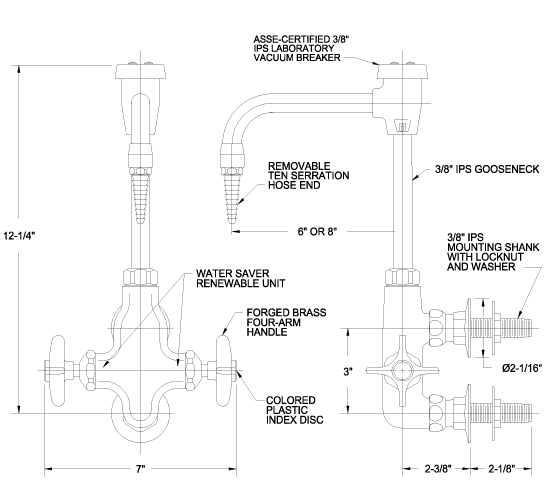 Panel mount mixing faucet with 6″ or 8″ rigid vaccum breaker gooseneck
