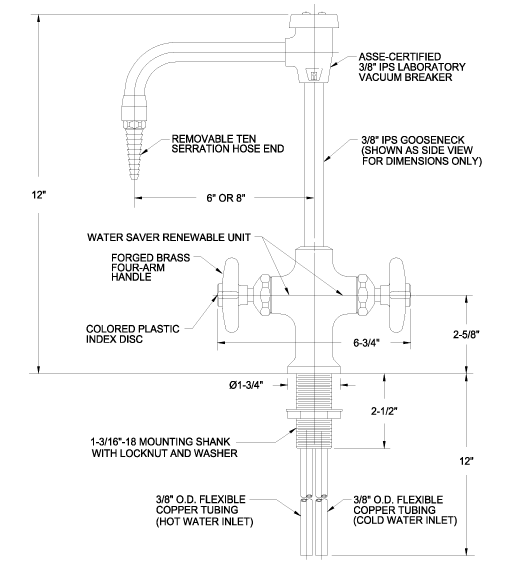 Deck mounted laboratory mixing faucet with 6″ swing gooseneck